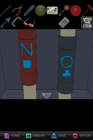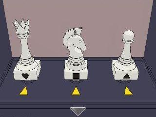 左下の扉を開けると3つのチェスの駒があり、それぞれ『▲→◇、□→スペード、ハート→クローバー』に合わせることでハンドルを操作するのが本来の流れであったように思える。