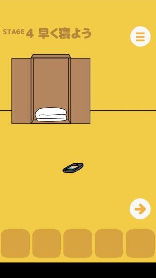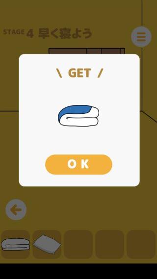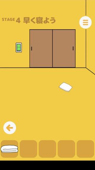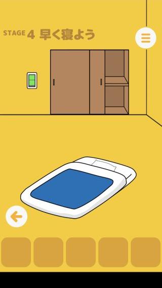 脱出ゲーム 君のいない生活からの脱出 無料 3.3 評価する 送信する ANDG CO., LTD. STAGE 4 早く寝よう クローゼットを開ける。 「敷布団」を入手して、右に移動。 「枕」を入手して、押し入れを開ける。 「掛け布団」を入手して、床に「敷布団」を使う。 「枕」と「掛け布団」を置く。 壁のスイッチで電気を消す。 STAGE 1 髪を切ろう STAGE 2 着替えよう STAGE 3 ヒゲをそろう STAGE 4 早く寝よう STAGE 5 仕上げよう STAGE 6 料理しよう STAGE 7 洗濯しよう STAGE 8 片付けよう STAGE 9 ゲームしない STAGE 10 小説を読もう STAGE 11 言葉に注意 STAGE 12 よく食べよう STAGE 13 ダイエット STAGE 14 筋トレしよう STAGE 15 食事マナー STAGE 16 正解しよう STAGE 17 帰らせよう STAGE 18 就職活動 STAGE 19 誕生日を祝おう STAGE 20 猫と仲良く STAGE 21 ゆすらない STAGE 22 スマホを見ない STAGE 23 虫を退治 STAGE 24 達筆になろう STAGE 25 誘惑に勝とう STAGE 26 水を止めよう STAGE 27 STAGE 28 聖剣を返還 STAGE 29 大事なもの? STAGE 30 あきらめよう True Endingの出し方
