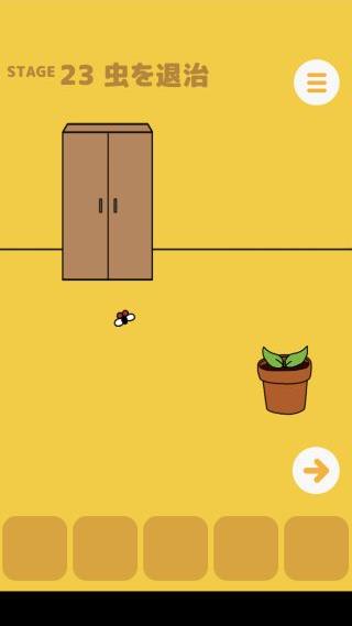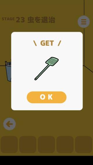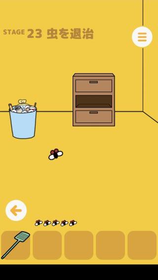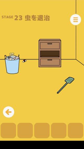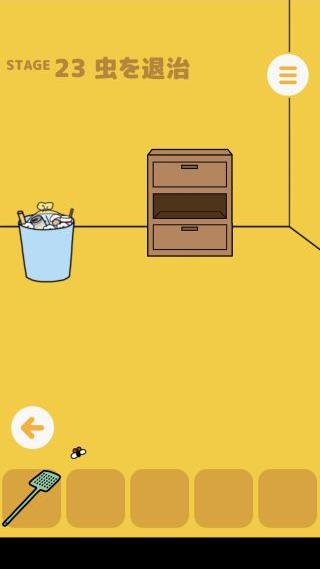 脱出ゲーム 君のいない生活からの脱出 無料 3.3 評価する 送信する ANDG CO., LTD. STAGE 23 虫を退治 右に移動。 「ハエ叩き」を入手して、飛んでいるハエに使っていく。 大きなハエが出てきたら、何度も叩く。 STAGE 1 髪を切ろう STAGE 2 着替えよう STAGE 3 ヒゲをそろう STAGE 4 早く寝よう STAGE 5 仕上げよう STAGE 6 料理しよう STAGE 7 洗濯しよう STAGE 8 片付けよう STAGE 9 ゲームしない STAGE 10 小説を読もう STAGE 11 言葉に注意 STAGE 12 よく食べよう STAGE 13 ダイエット STAGE 14 筋トレしよう STAGE 15 食事マナー STAGE 16 正解しよう STAGE 17 帰らせよう STAGE 18 就職活動 STAGE 19 誕生日を祝おう STAGE 20 猫と仲良く STAGE 21 ゆすらない STAGE 22 スマホを見ない STAGE 23 虫を退治 STAGE 24 達筆になろう STAGE 25 誘惑に勝とう STAGE 26 水を止めよう STAGE 27 STAGE 28 聖剣を返還 STAGE 29 大事なもの? STAGE 30 あきらめよう True Endingの出し方