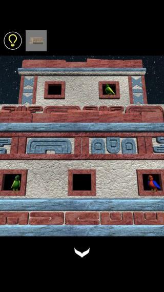 建物の上の窓を拡大して、3羽の鳥の位置と色を確認。