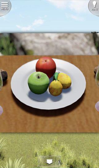 テーブルの上のフルーツの色と数『赤1、緑1、黄2』を確認。
