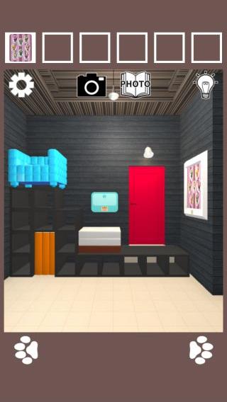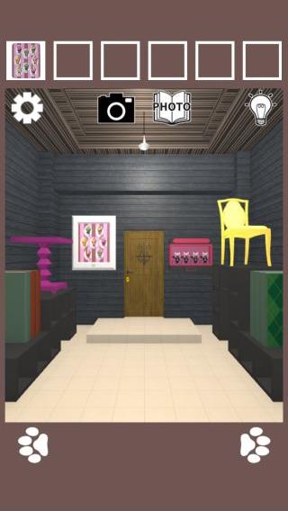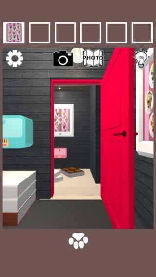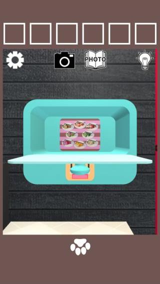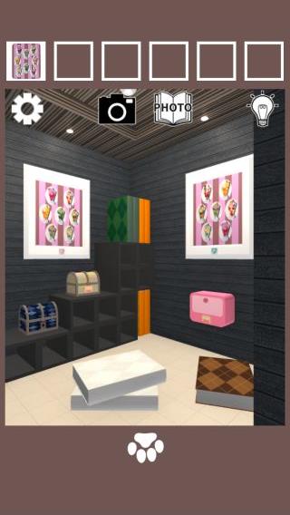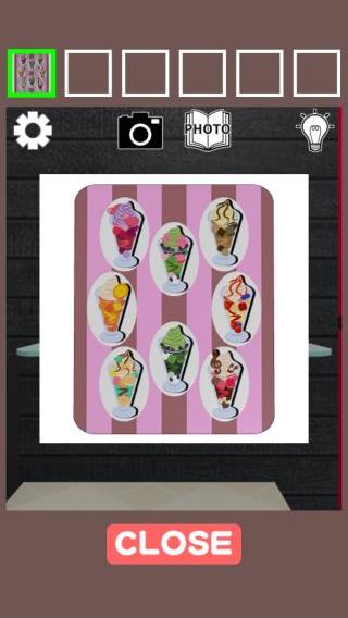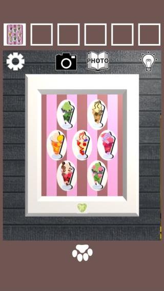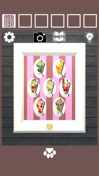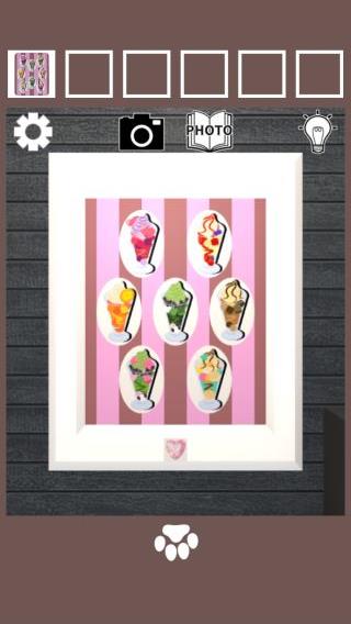 反対側に移動して、壁の額を拡大して「カード」には無いパフェと下のハートの色を確認。