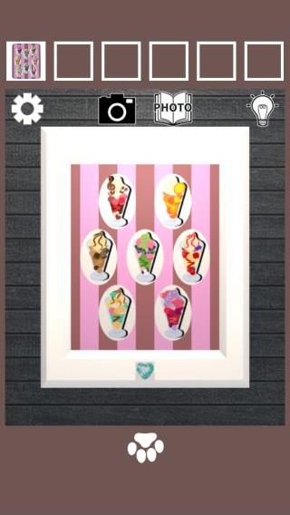 壁の2つの額を拡大して、「カード」には無いパフェと下のハートの色を確認。