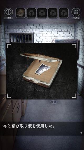 脱出ゲーム - 監獄からの脱出 無料 2.9 評価する 送信する LIB(Kazunori Shojima) STAGE 8 右に落ちている「錆び取り液」を入手。 左から「布」を入手して、「錆び取り液」を組み合わせる。 「錆びた箱」を拡大して、「布と錆び取り液」を使う。 中から「写真の切れ端」を入手。 STAGE 1 STAGE 2 STAGE 3 STAGE 4 STAGE 5 STAGE 6 STAGE 7 STAGE 8 STAGE 9 STAGE 10 STAGE 11 STAGE 12 STAGE 13 STAGE 14 STAGE 15 STAGE 16 STAGE 17 STAGE 18 STAGE 19 STAGE 20