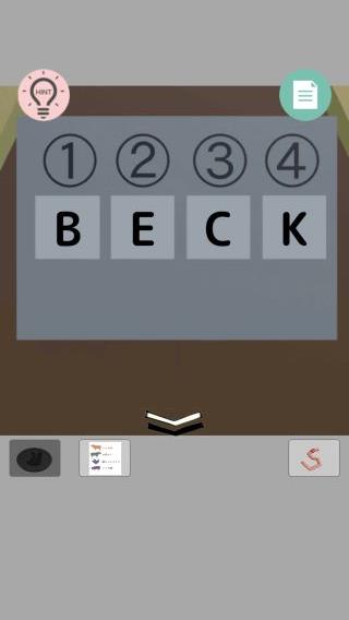 壁の張り紙を拡大して、「メモ」の◎の位置の文字を数字の順で繋げると『BECK』となる。