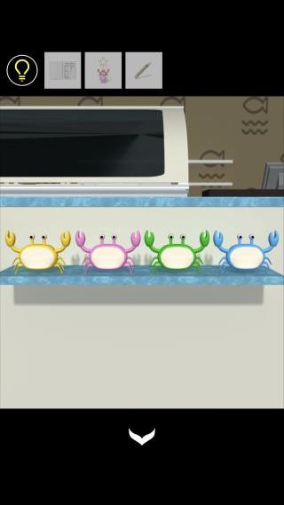 反対側に移動して、中央右のカニの色『黄紫緑青』を確認。