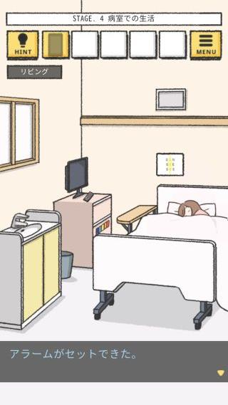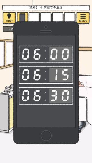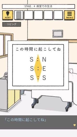 脱出ゲーム 彼女の願いは叶わなかった 無料 3.4 評価する 送信する LIB(Kazunori Shojima) Chapter 4 病室での生活 病室内をタップで片付ける。 壁の暗号を調べる。 『S=南(下)、N=北(上)、E=東(右)』を表している。 持っている「スマートフォン」を拡大。 方角を時計の時刻と見立てて、上から『00、15、30』に合わせる。 Chapter 1 彼女のいない朝 Chapter 2 彼女のお見舞い Chapter 3 彼女の欲しいもの Chapter 4 病室での生活 Chapter 5 体調の悪い日 Chapter 6 郵便物 Chapter 7 普通の暮らし Chapter 8 二人の洗濯物 Chapter 9 一人きりの部屋 Chapter 10 病室での仕事 Chapter 11 たくさんの薬 Chapter 12 かわいい洋服 Chapter 13 彼女とのメール Chapter 14 パンクした自転車 Chapter 15 二人の写真 Chapter 16 彼女の病室 Chapter 17 僕からの招待状 Chapter 18 彼女への贈り物 Chapter 19 彼女のアルバム Chapter 20 指輪 Chapter 21 好きな音楽 Chapter 22 衣装屋からの電話 Chapter 23 二人だけの結婚式
