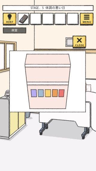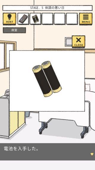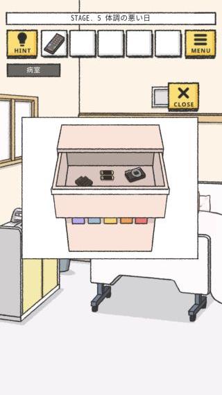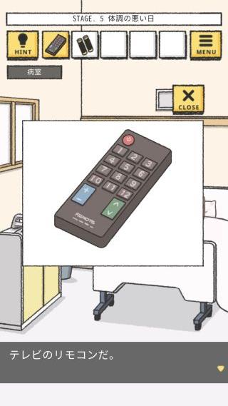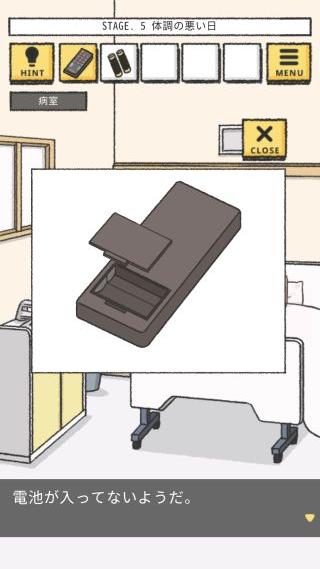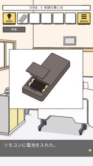 脱出ゲーム 彼女の願いは叶わなかった 無料 3.4 評価する 送信する LIB(Kazunori Shojima) Chapter 5 体調の悪い日 中央の棚の上から「テレビのリモコン」を入手。 中央の棚の引き出しを開ける。 「電池」を入手して、「テレビのリモコン」を拡大。 「電池」をセットする。 睡眠に関係するワードをタップしていく。 Chapter 1 彼女のいない朝 Chapter 2 彼女のお見舞い Chapter 3 彼女の欲しいもの Chapter 4 病室での生活 Chapter 5 体調の悪い日 Chapter 6 郵便物 Chapter 7 普通の暮らし Chapter 8 二人の洗濯物 Chapter 9 一人きりの部屋 Chapter 10 病室での仕事 Chapter 11 たくさんの薬 Chapter 12 かわいい洋服 Chapter 13 彼女とのメール Chapter 14 パンクした自転車 Chapter 15 二人の写真 Chapter 16 彼女の病室 Chapter 17 僕からの招待状 Chapter 18 彼女への贈り物 Chapter 19 彼女のアルバム Chapter 20 指輪 Chapter 21 好きな音楽 Chapter 22 衣装屋からの電話 Chapter 23 二人だけの結婚式