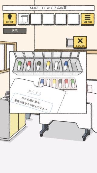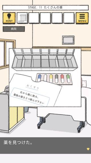 脱出ゲーム 彼女の願いは叶わなかった 無料 3.4 評価する 送信する LIB(Kazunori Shojima) Chapter 11 たくさんの薬 中央の棚の上の薬を調べる。 右から順に入れていき、最後の青は2つ入れる。 右上のレバーを長押しで水を入れる。 Chapter 1 彼女のいない朝 Chapter 2 彼女のお見舞い Chapter 3 彼女の欲しいもの Chapter 4 病室での生活 Chapter 5 体調の悪い日 Chapter 6 郵便物 Chapter 7 普通の暮らし Chapter 8 二人の洗濯物 Chapter 9 一人きりの部屋 Chapter 10 病室での仕事 Chapter 11 たくさんの薬 Chapter 12 かわいい洋服 Chapter 13 彼女とのメール Chapter 14 パンクした自転車 Chapter 15 二人の写真 Chapter 16 彼女の病室 Chapter 17 僕からの招待状 Chapter 18 彼女への贈り物 Chapter 19 彼女のアルバム Chapter 20 指輪 Chapter 21 好きな音楽 Chapter 22 衣装屋からの電話 Chapter 23 二人だけの結婚式