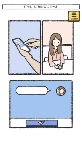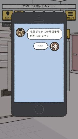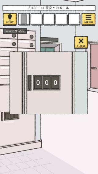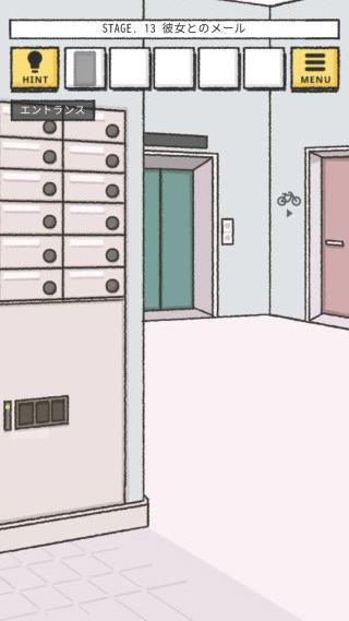 脱出ゲーム 彼女の願いは叶わなかった 無料 3.4 評価する 送信する LIB(Kazunori Shojima) Chapter 13 彼女とのメール 左下の宅配ボックスを調べる。 「スマートフォン」を調べて、『ONE』を確認。 『O=0、N=2、E=3』に変換して『023』に合わせる。 送信ボタンをタップで会話を進め、スワイプ操作で時間を進める。 Chapter 1 彼女のいない朝 Chapter 2 彼女のお見舞い Chapter 3 彼女の欲しいもの Chapter 4 病室での生活 Chapter 5 体調の悪い日 Chapter 6 郵便物 Chapter 7 普通の暮らし Chapter 8 二人の洗濯物 Chapter 9 一人きりの部屋 Chapter 10 病室での仕事 Chapter 11 たくさんの薬 Chapter 12 かわいい洋服 Chapter 13 彼女とのメール Chapter 14 パンクした自転車 Chapter 15 二人の写真 Chapter 16 彼女の病室 Chapter 17 僕からの招待状 Chapter 18 彼女への贈り物 Chapter 19 彼女のアルバム Chapter 20 指輪 Chapter 21 好きな音楽 Chapter 22 衣装屋からの電話 Chapter 23 二人だけの結婚式