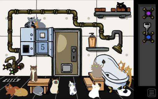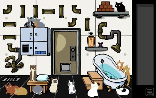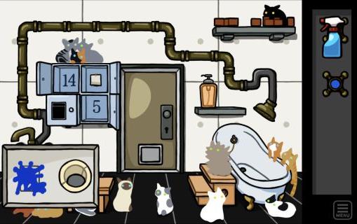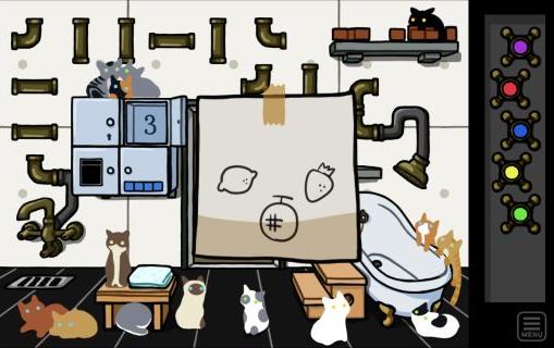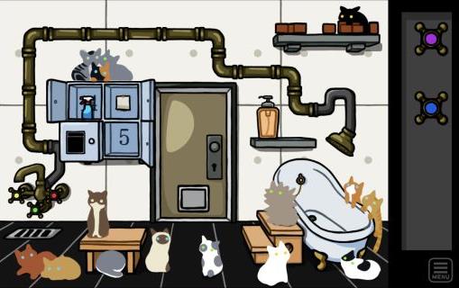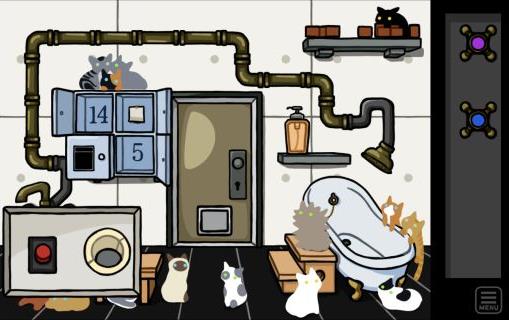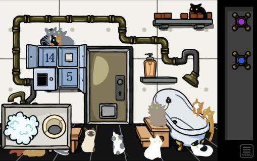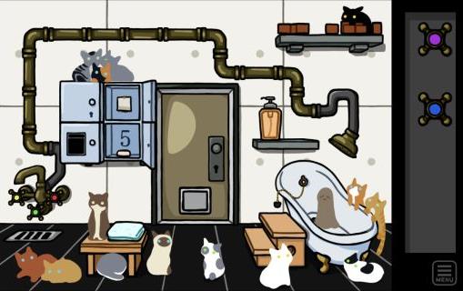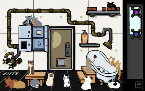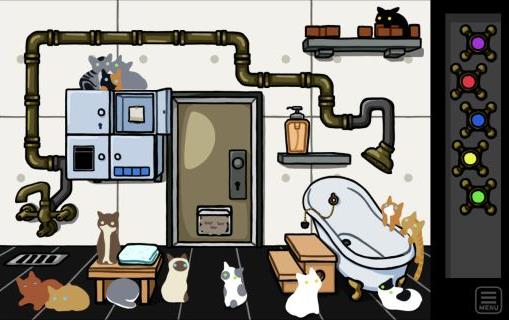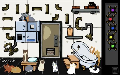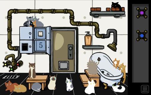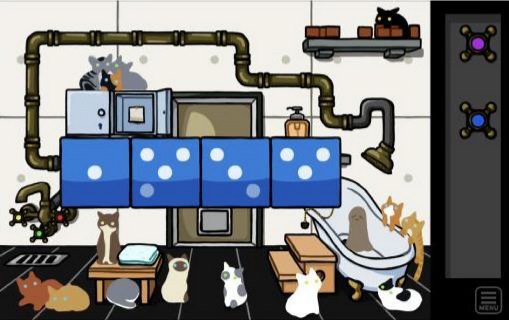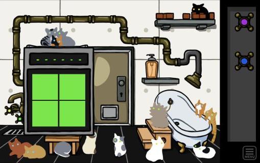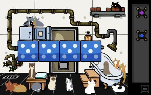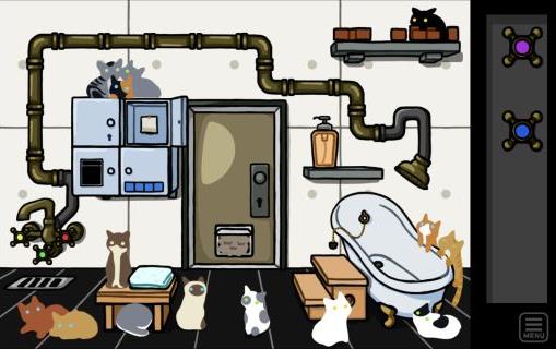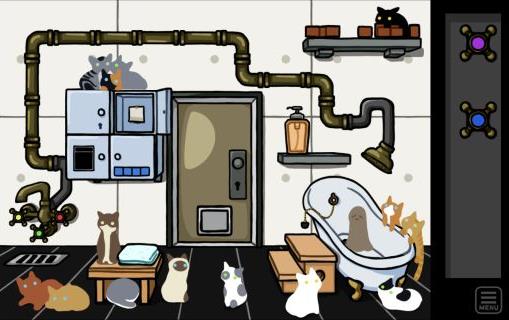 左下の蛇口の左に「黄色いハンドル」、下に「緑のハンドル」、右に「赤いハンドル」を取り付けて、扉の猫用出入り口をタップして汚れた猫をバスタブに入れる。