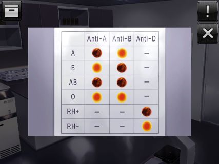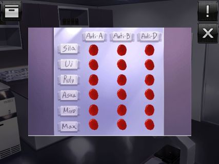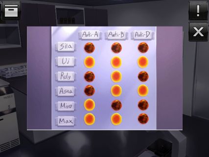 壁に貼られている表を見て、6人の患者の血液型を確認する。