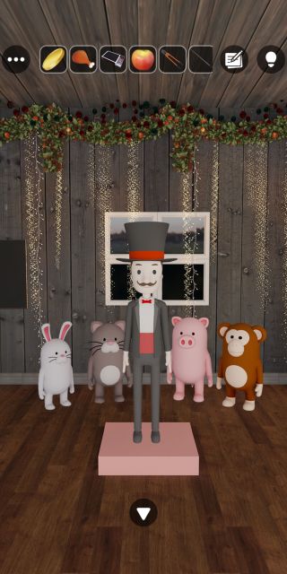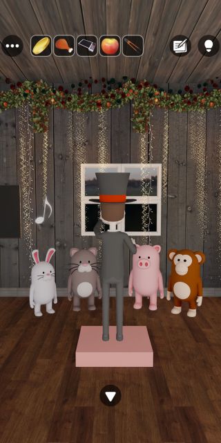 奥の指揮者に「指揮棒」を渡して、音符が『ウサギ、サル、ブタ、ネコ』の順で出るのを確認。