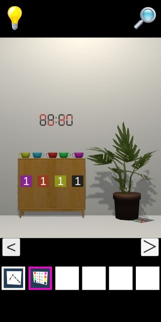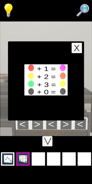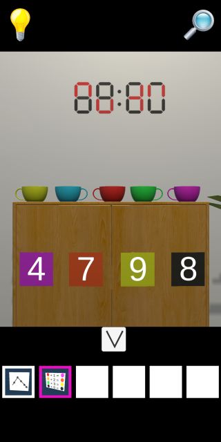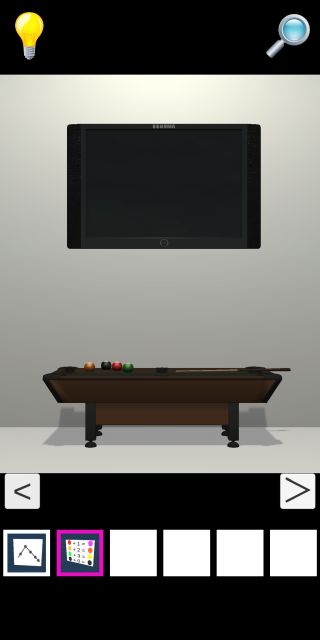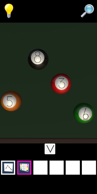 ビリヤード台を拡大して、2枚の「メモ」をヒントに『5836』の順番と『紫=4、オレンジ=7、黄=9、黒=8』となるのを確認。