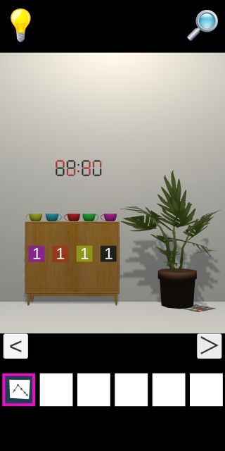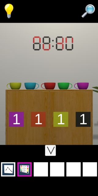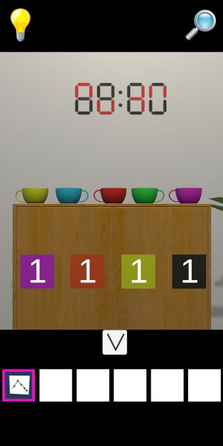 棚の上のカップの取っ手の向きを『紫青黄緑赤』の順で見ると『左右左右左』となる。