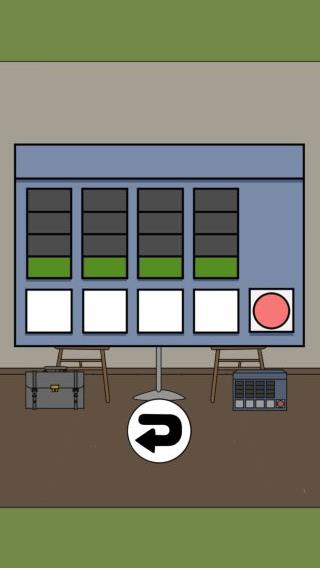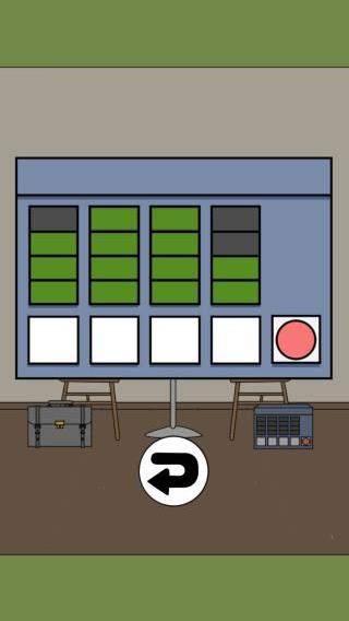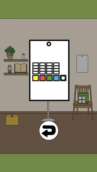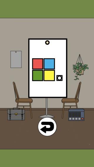 壁の張り紙で『左上=赤、右上=青、左下=緑、右下=黄』を確認。