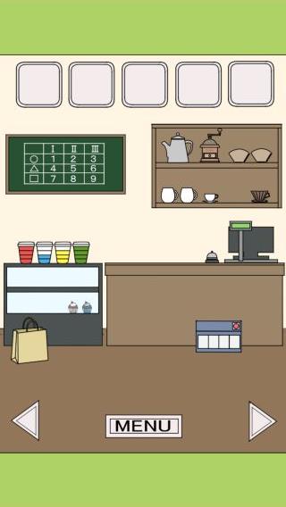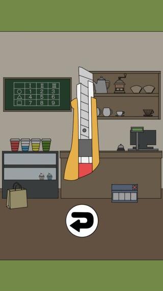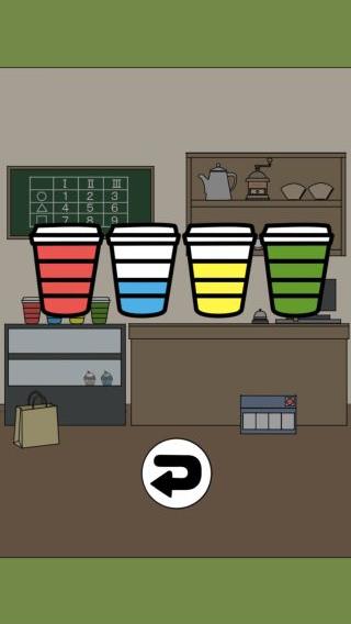 ショーケースの上のコップを拡大して、『赤=4、青=2、黄=3、緑=4』を確認。