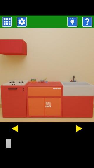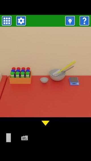 中央の作業台を拡大して、調味料の色『上=赤、中=青、下=緑』を確認。
