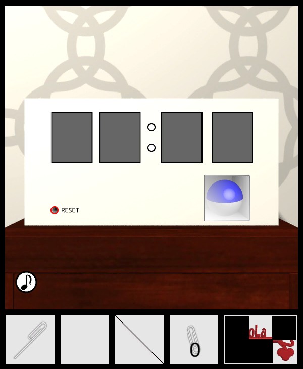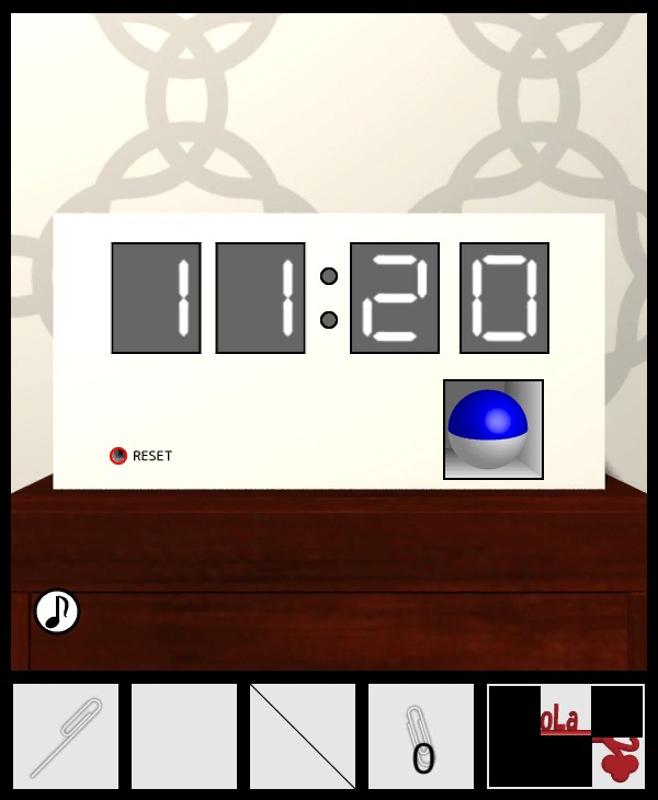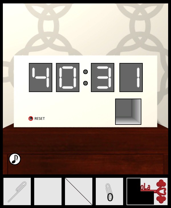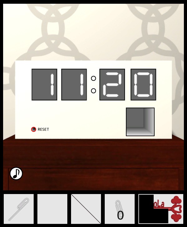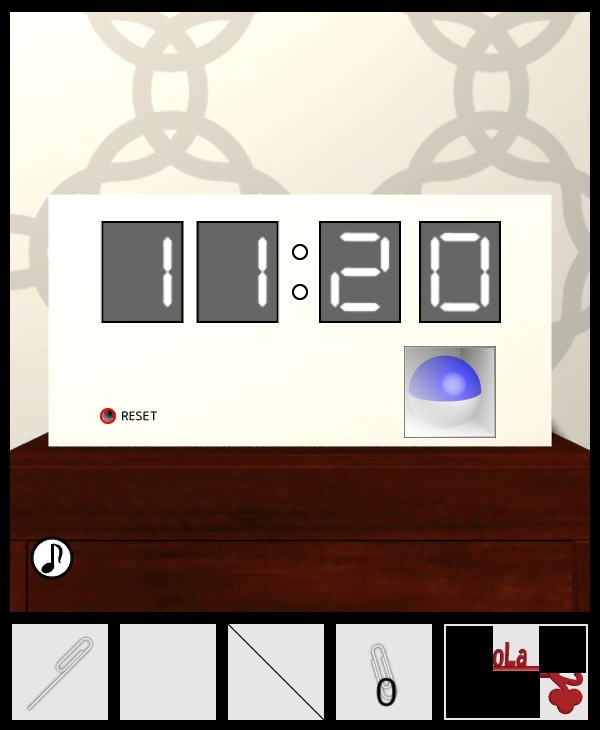 右のデジタル時計を拡大して、左下の穴に「伸ばしたゼムクリップ」を使う。