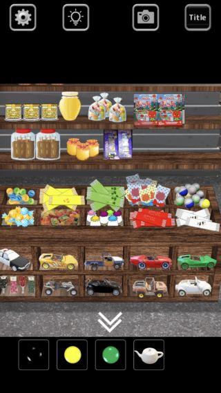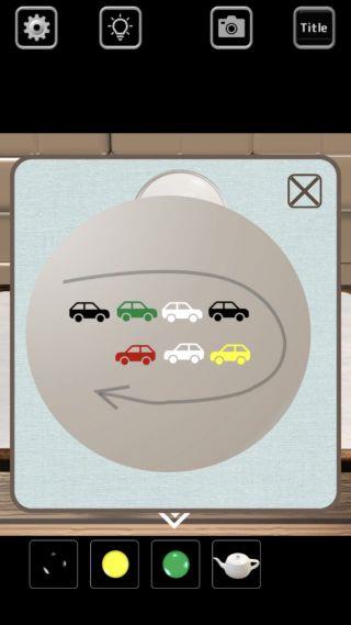 駄菓子屋の下の車のおもちゃを『黒緑白黒黄白赤』の順で見て、それぞれの位置を確認。