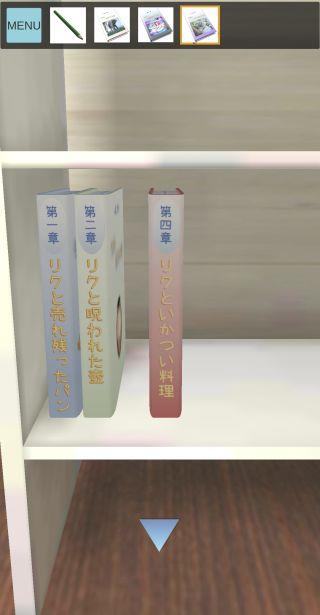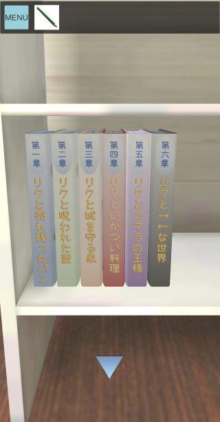 一番右の本の『←』から左に文字を読むと『アかをわれ(赤を割れ)』となる。