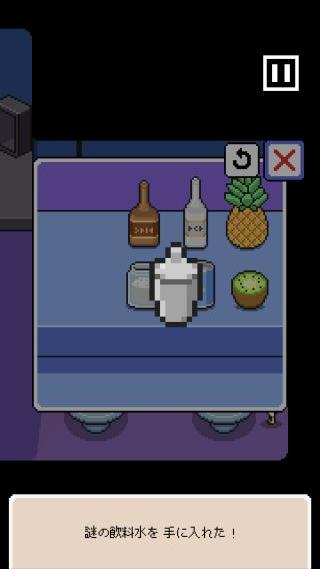 右のテーブルの上の左のグラスに「謎の飲料水」を使う。