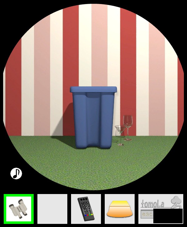 左奥のゴミ箱を「双眼鏡」で調べて、2種類のグラスを確認。