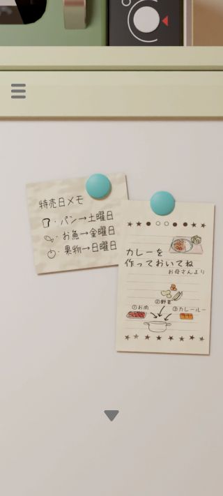 冷凍室の扉の張り紙を拡大して、特売日の『パン→土曜日、お魚→金曜日、果物→日曜日』を確認。