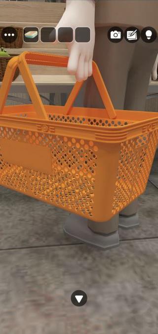 右の男性のオレンジのカゴを拡大して、模様を確認。