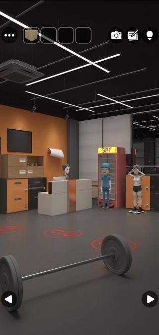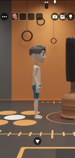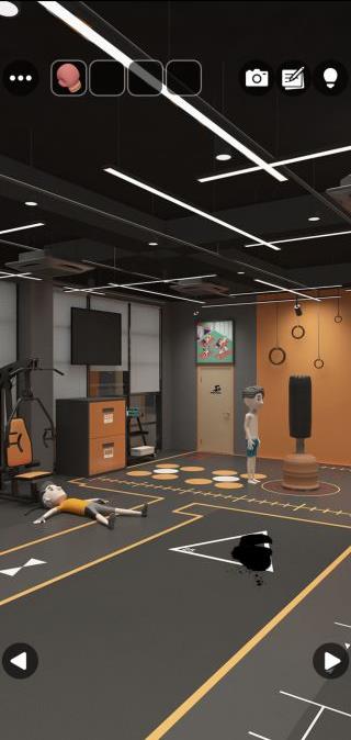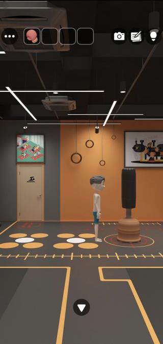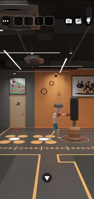 サンドバッグの前の男性に「グローブ」を渡して、『パンチ、肘打ち、頭突き、キック』を確認。