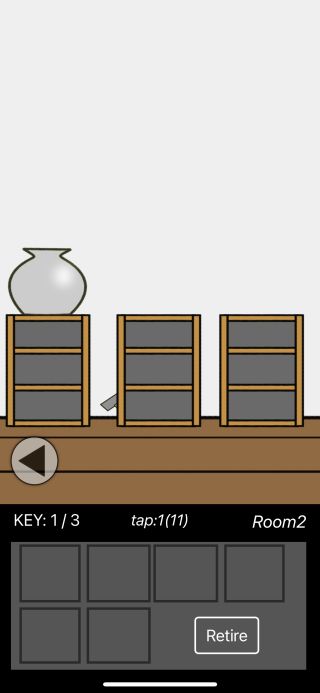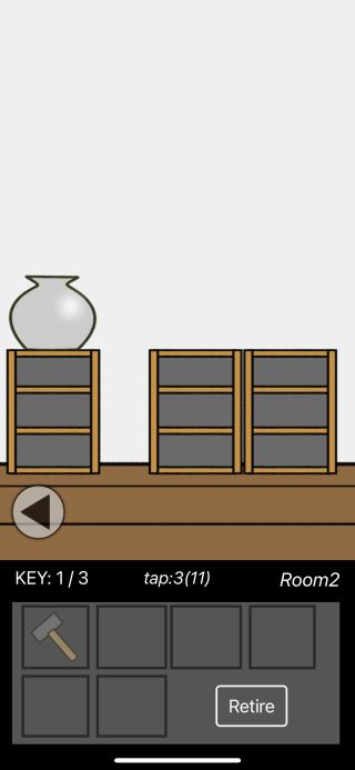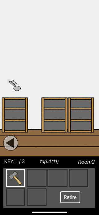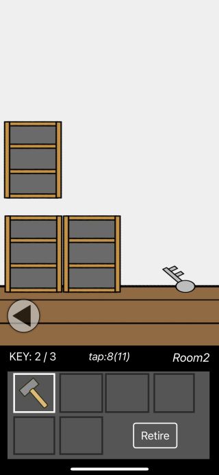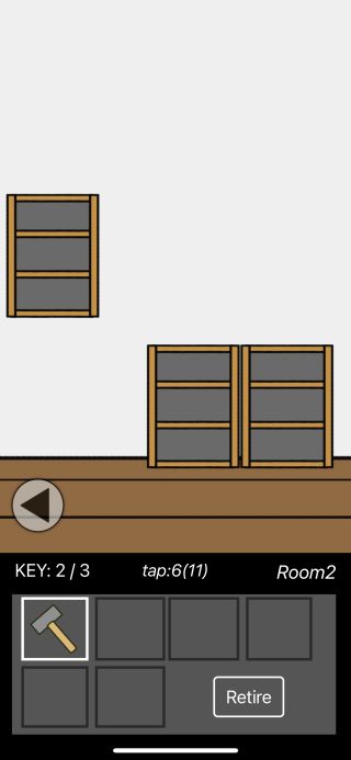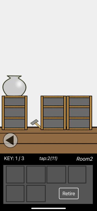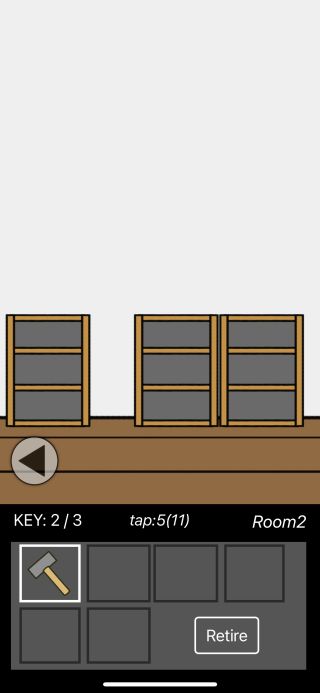 無料 評価する 送信する Room 2 右に移動。 中央の棚から「カギ」を入手して、中央の棚を右に動かす。 「ハンマー」を入手して、壺を割る。 「カギ」を入手して、左の棚を上に持ち上げる。 右の棚を左に動かして、「カギ」を入手。 左に移動して、扉を開ける。 Room 1 Room 2