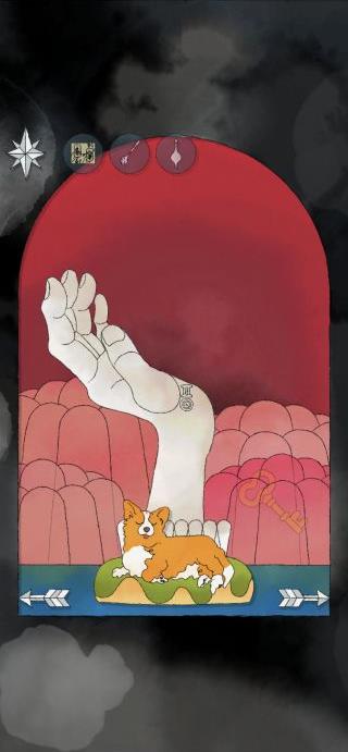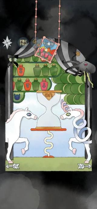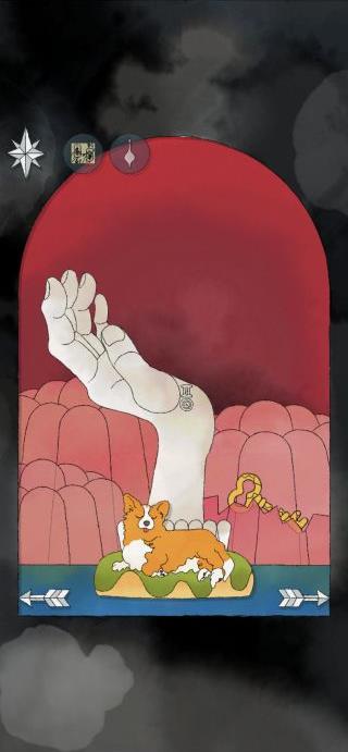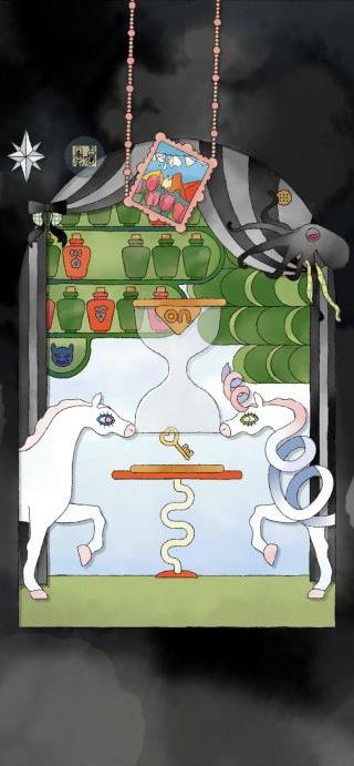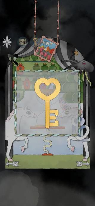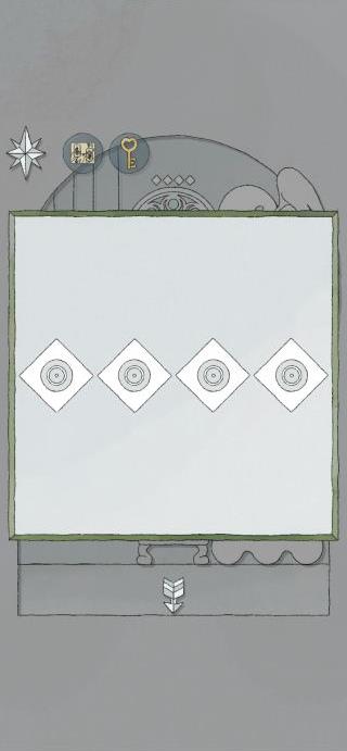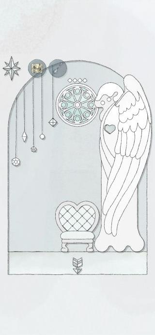 右の白い部屋に移動して、左上の5つの飾りの高さを確認。