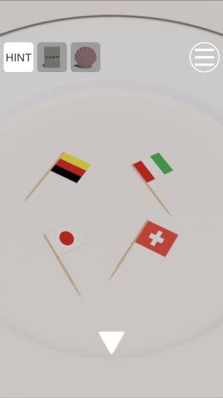 皿の上の国旗を『日本、ドイツ、イタリア、スイス』の順で見て、国旗を構成している図形を確認。
