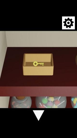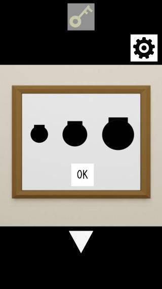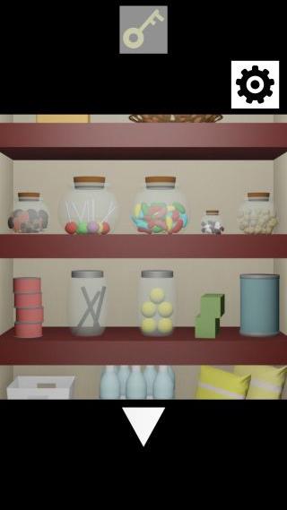 棚の中央を拡大して、下の段に置かれている物の数の順で上のビンの大きさが『中小大中大』なのを確認。