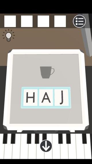 テーブルの上の3種類のコップの並びでアルファベットの『HAJ』の形となる。