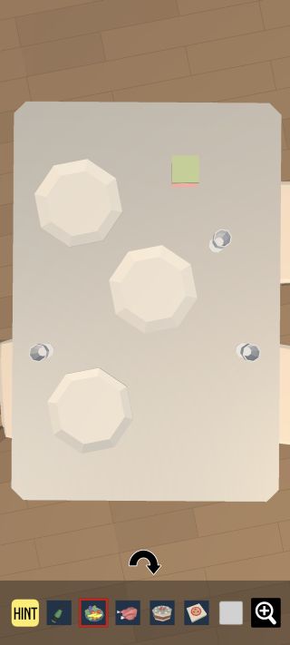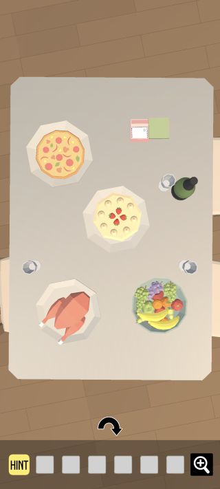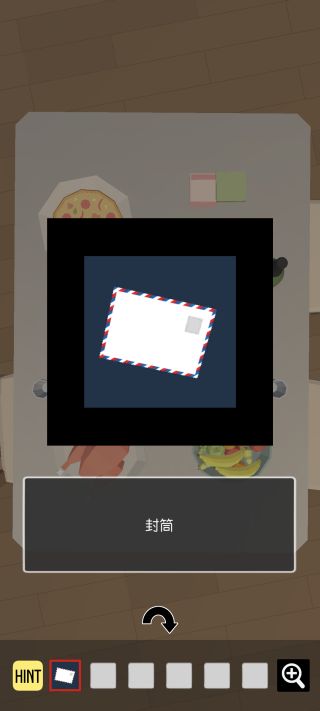 「ピザ」「ケーキ」「フルーツ」「チキン」「ワイン」を使って、「封筒」を入手。
