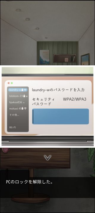 中央のテーブルの上のノートパソコンを調べる。