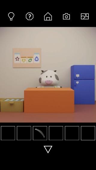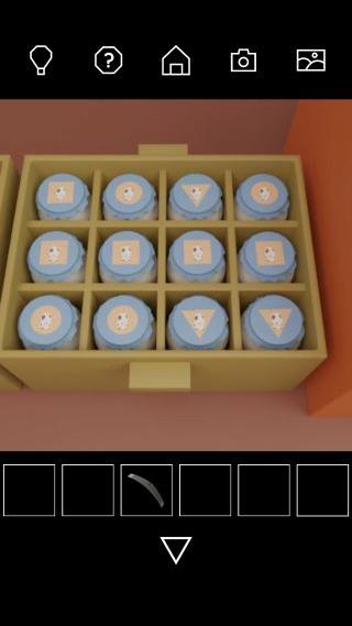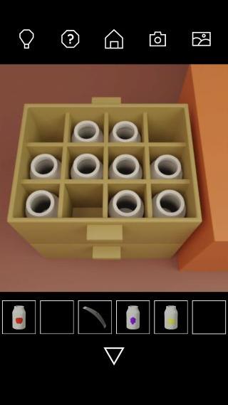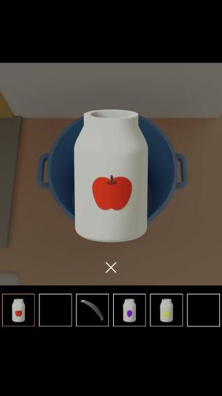 地下室のタンスの中の張り紙をヒントに、左上に「ブドウのビン」、下に「リンゴのビン」、右上に「バナナのビン」をセットする。