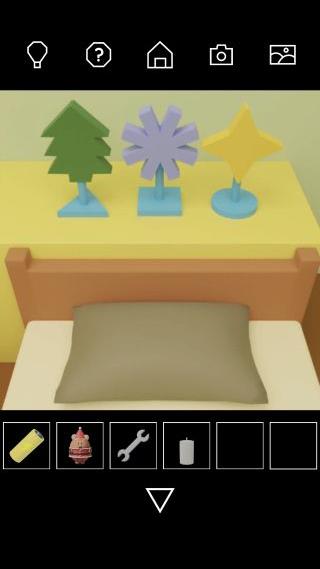 右のベッドを拡大して、3つのオブジェの形と台座の形を確認。