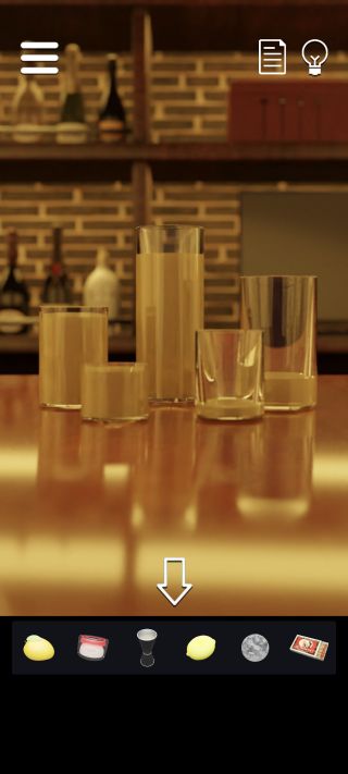 カウンターの左のグラスを拡大して、中身の量の多い順で左から『3、1、2、5、4番目』を確認。