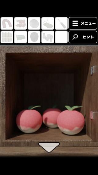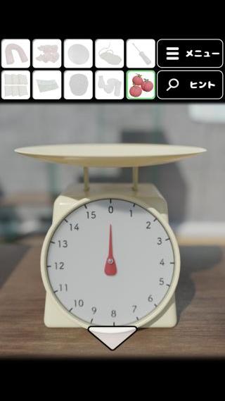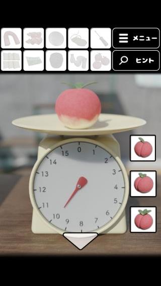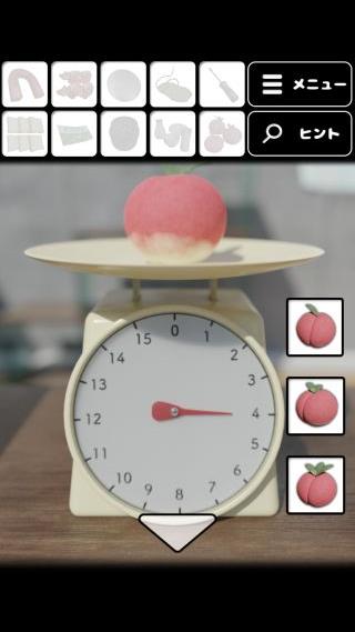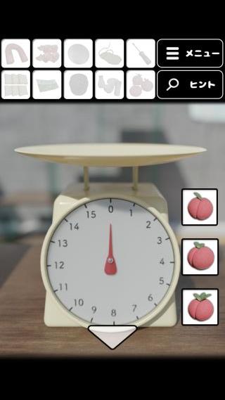 張り紙を拡大して、桃のヘタの数で重さを当てはめると左から『10、15、2、1、14』となる。