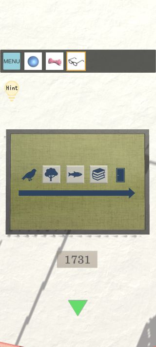 右から2番目の絵を拡大して、『左から2番目=メガネ、一番右=リボン』を確認。