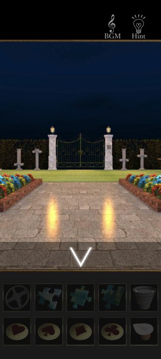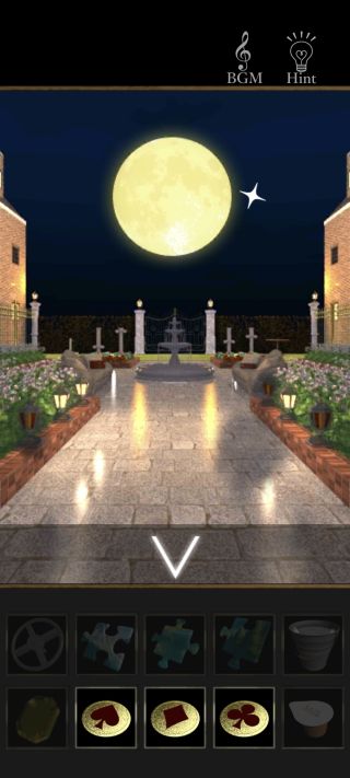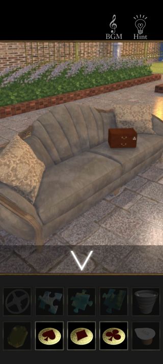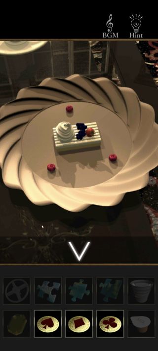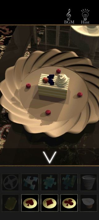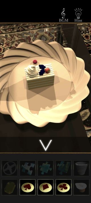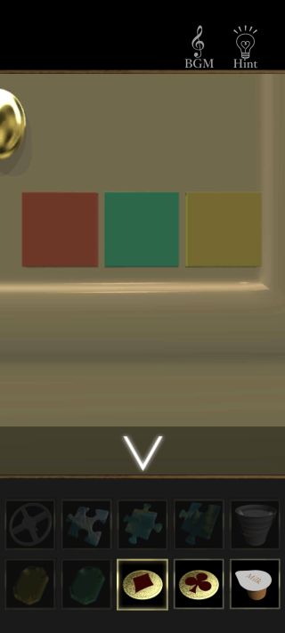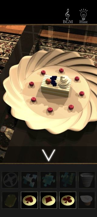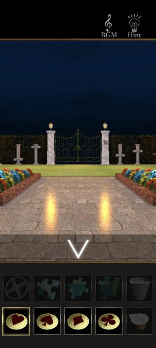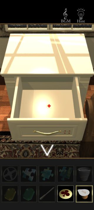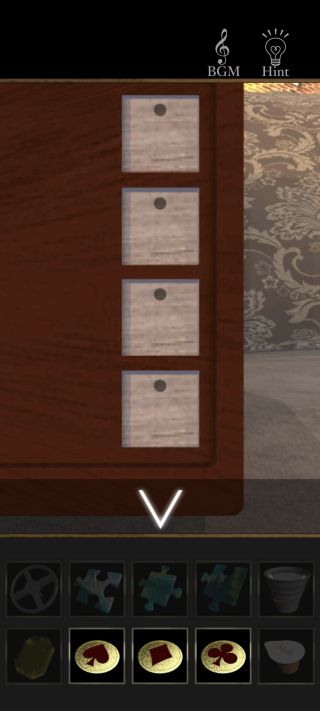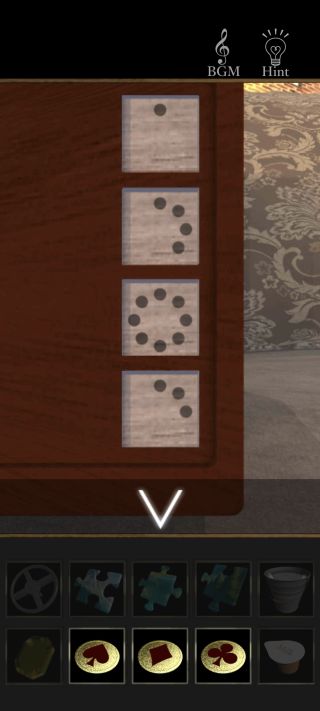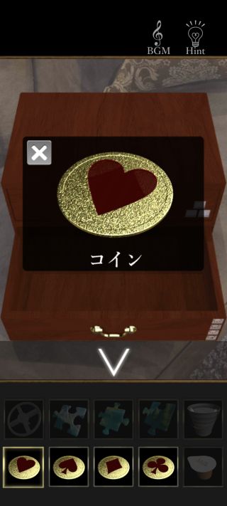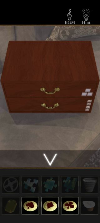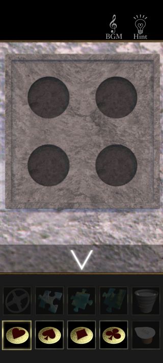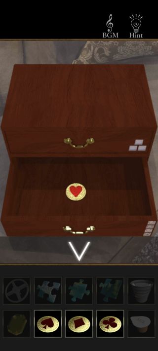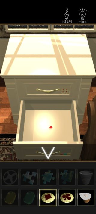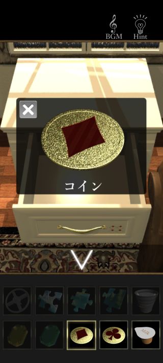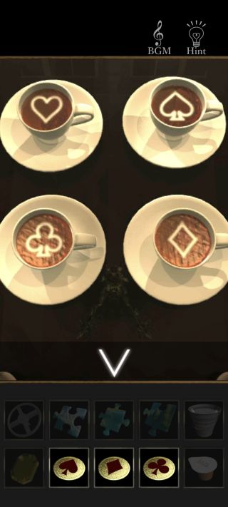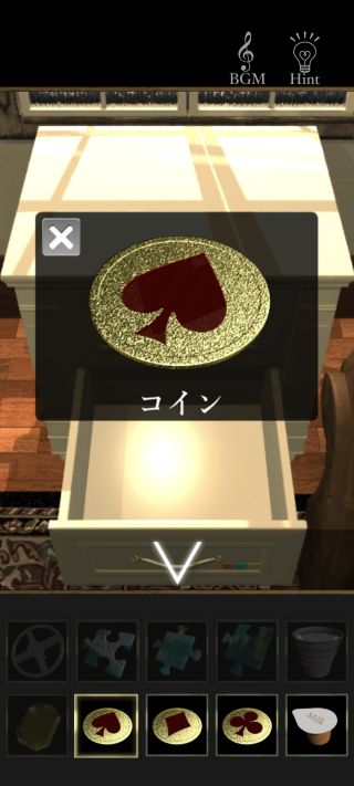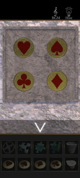 「コイン」を『左上=♥、右上=♠、左下=♣、右下=♦』にはめて、脱出。