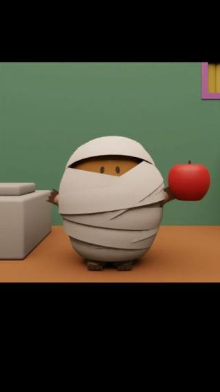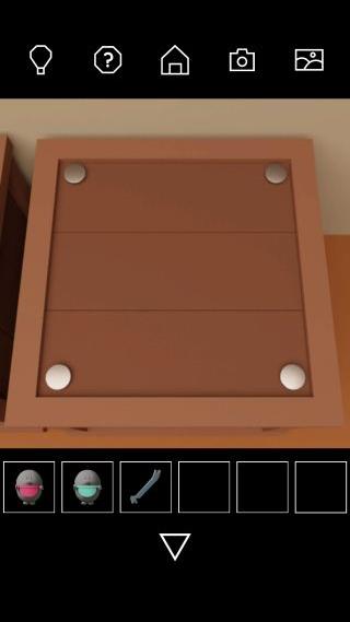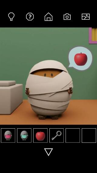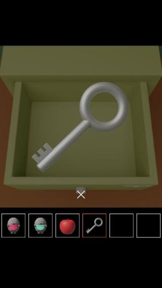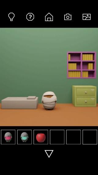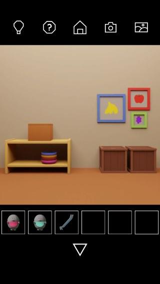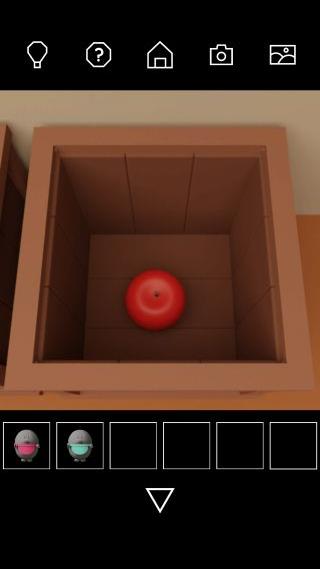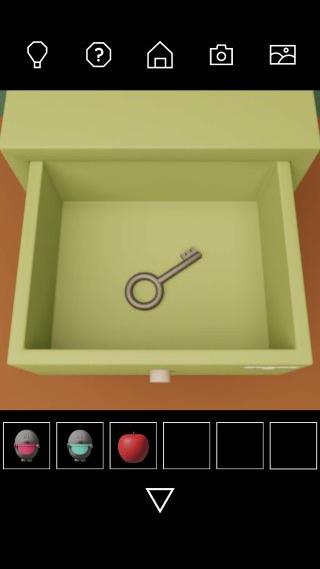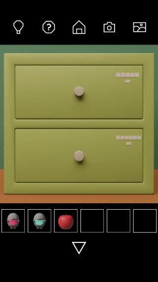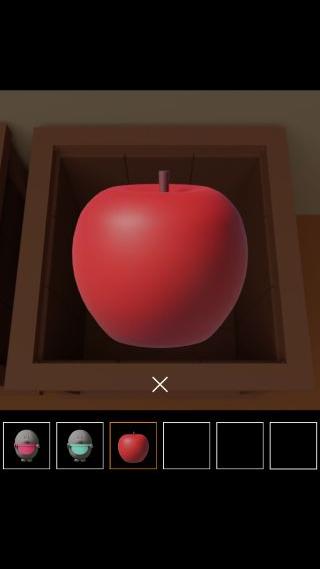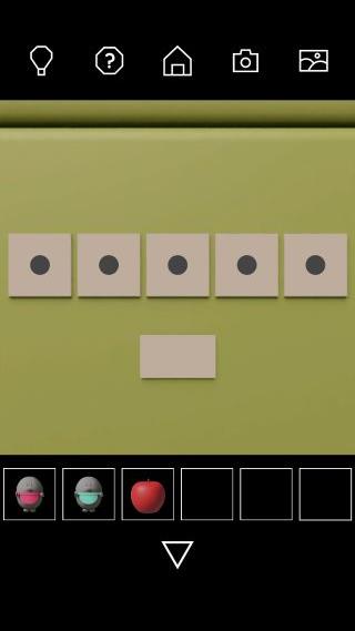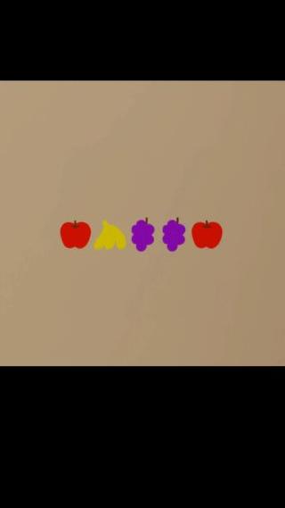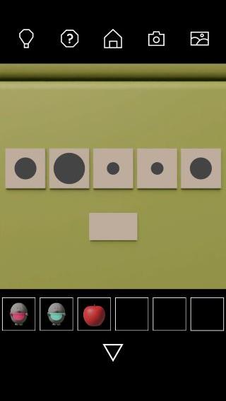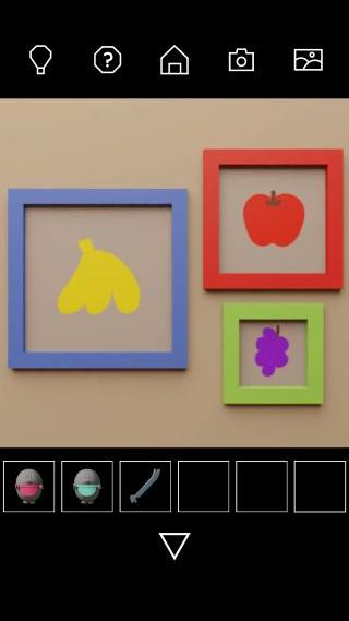 壁の額を拡大して、『リンゴ、バナナ、ブドウ、ブドウ、リンゴ』の順で『中大小小中』を確認。