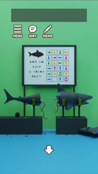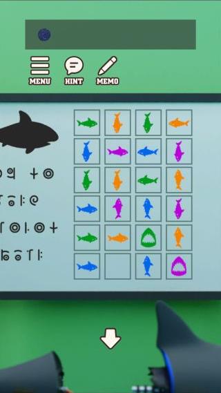 ボードを拡大して、『緑、オレンジ、青、紫』の順で同じ色のサメの向きの順で辿ると数字の『2097』となる。