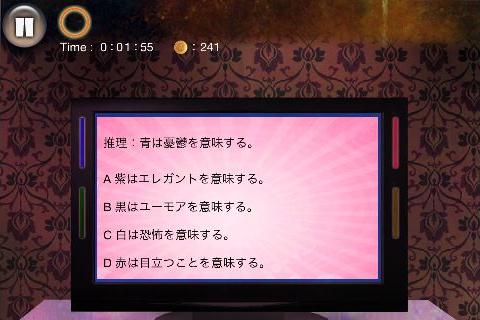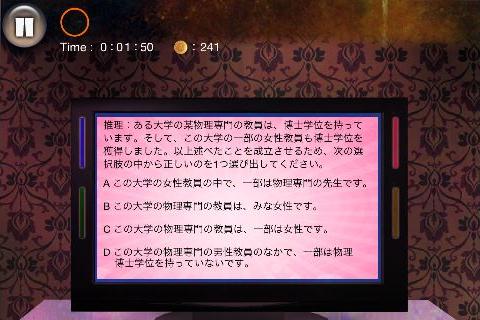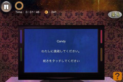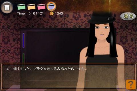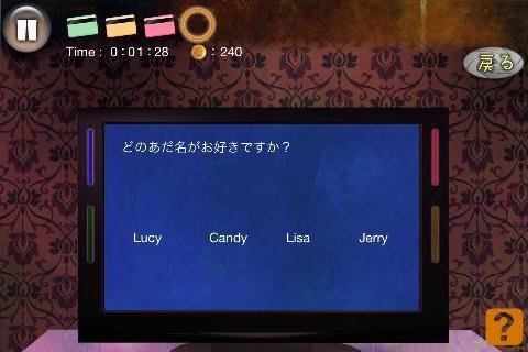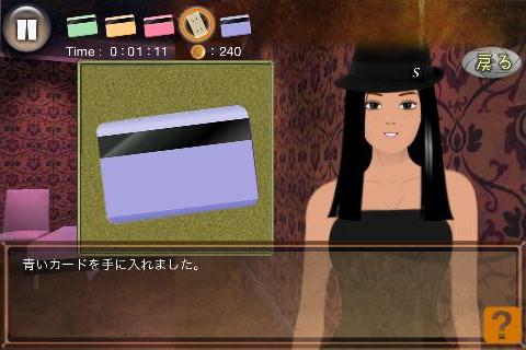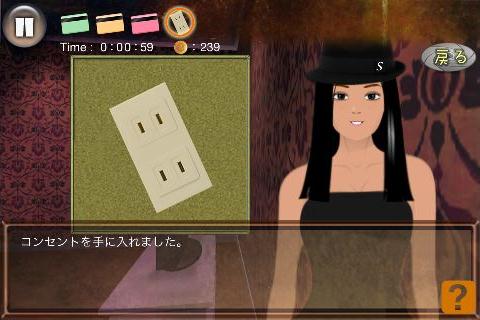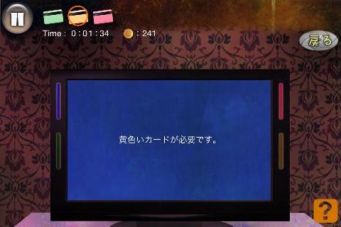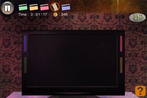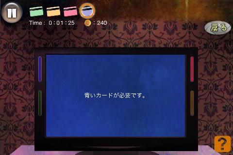 無料 評価する 送信する 攻略その2 テレビの後ろ(テレビ台の右をタップ)から、「コンセント」を入手。 左に2回移動する。 机の後ろ(画面左下隅をタップ)から、「青いカード」を入手。 右に2回移動する。 テレビを拡大して、「コンセント」を使う。 「赤いカード」を右上に入れて、名前を選択。(何でもよい) 同様に指示通りに残りの「カード」も入れていく。 選択肢は全て何を選んでも良い。 最初の問題は『B』、2問目は『A』を選択する。 最後の問題は、下段右から2番目を選んで、「血痕の付いたキリ」を入手してクリア。 STAGE 1 攻略その1 攻略その2 攻略その3 攻略その4 STAGE 2 攻略その1 攻略その2 攻略その3 STAGE X 攻略その1 攻略その2