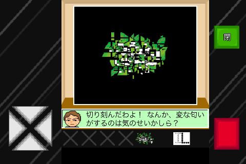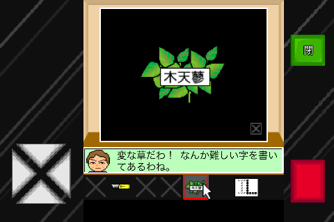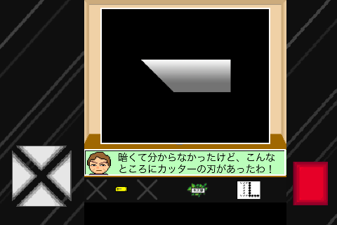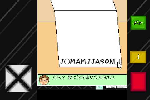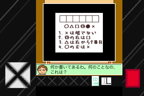「カード」と「メモ」を入手。4つの文章から『◎□×○△●』という並びになるので、対応するアルファベットを置き換えていく。