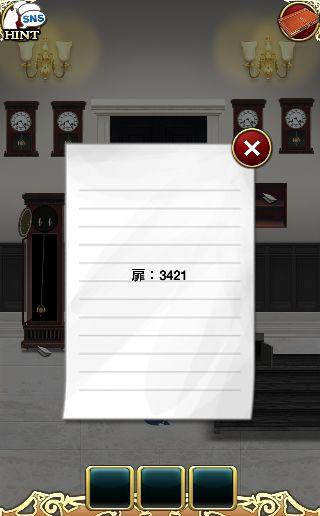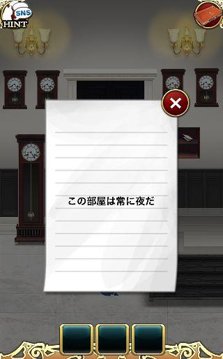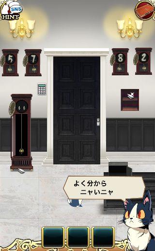 脱出!あにまる探偵[脱出ゲーム] 無料 0 評価する 送信する 第20話 第20話 沈黙の時計 右の棚のメモを確認。 時計の時間を24時間表記にすると『20:25』になる。 右のガラスケースを開けて、金庫を調べる。 『2025』を入力する。 「ゼンマイネジ」を入手して、柱時計を開ける。 「ゼンマイネジ」を使って、メモを確認。 壁の4つの時計を開けて数字を確認。 メモの数字の順で入れ替える。 『8275』を入力する。 本編攻略 第6話~第8話 第9話~第11話 第12話~第13話 第14話~第15話 第16話~第17話 第18話~第19話 第20話 第21話~第22話 第23話~第24話 第25話~第26話 第27話~第28話 第29話~第30話 第31話~第32話 第33話~第34話 第35話~第36話 第37話~第38話 第39話~第40話 シークレットアイテム 第1話~第10話 第11話~第20話 第21話~第30話 第31話~第40話