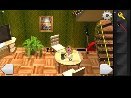 Room Escape - House 無料 0 評価する 送信する 攻略その2 パズルを解いて、「カギ」を入手。 右の床を拡大。 端末を右に傾けて、「斧」を入手。 右に移動して、右の壁のフックの高さを確認。 階段の手すりを拡大して、白い柱の間が『黄黒黄黄黒黒黄黄』となっているのを確認。 (柱のない部分は黒とする。) 左に移動して、テレビ台を拡大。 『黄黒黄黄黒黒黄黄』に合わせて、「カギ」を入手。 反対側に移動して、ソファーの前へ。 壁の装置を先ほどのフックの高さに合わせて、「カギ」を入手。 左の棚を拡大。 攻略その1 攻略その2 攻略その3