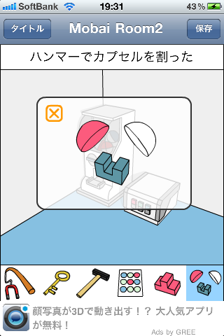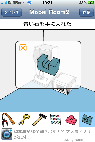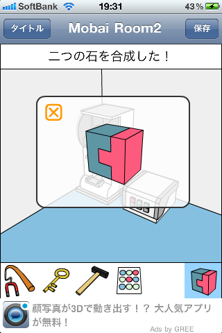 脱出 モバイルーム2 無料 5.0 評価する 送信する MOFUYA 攻略その3 同じように「ハンマー」で割って「青い石」を入手。 石を組み合わせてドアの前へ。 ドアにはめて脱出。 攻略その1 攻略その2 攻略その3